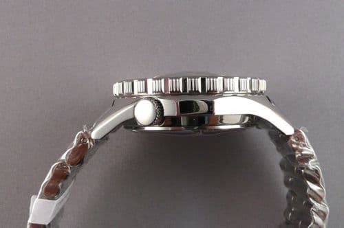 Polished stainless steel case with unidirectional ratchet style rotating diver’s bezel, hardened acrylic crystal with non screw-down winding crown and solid screw-on back